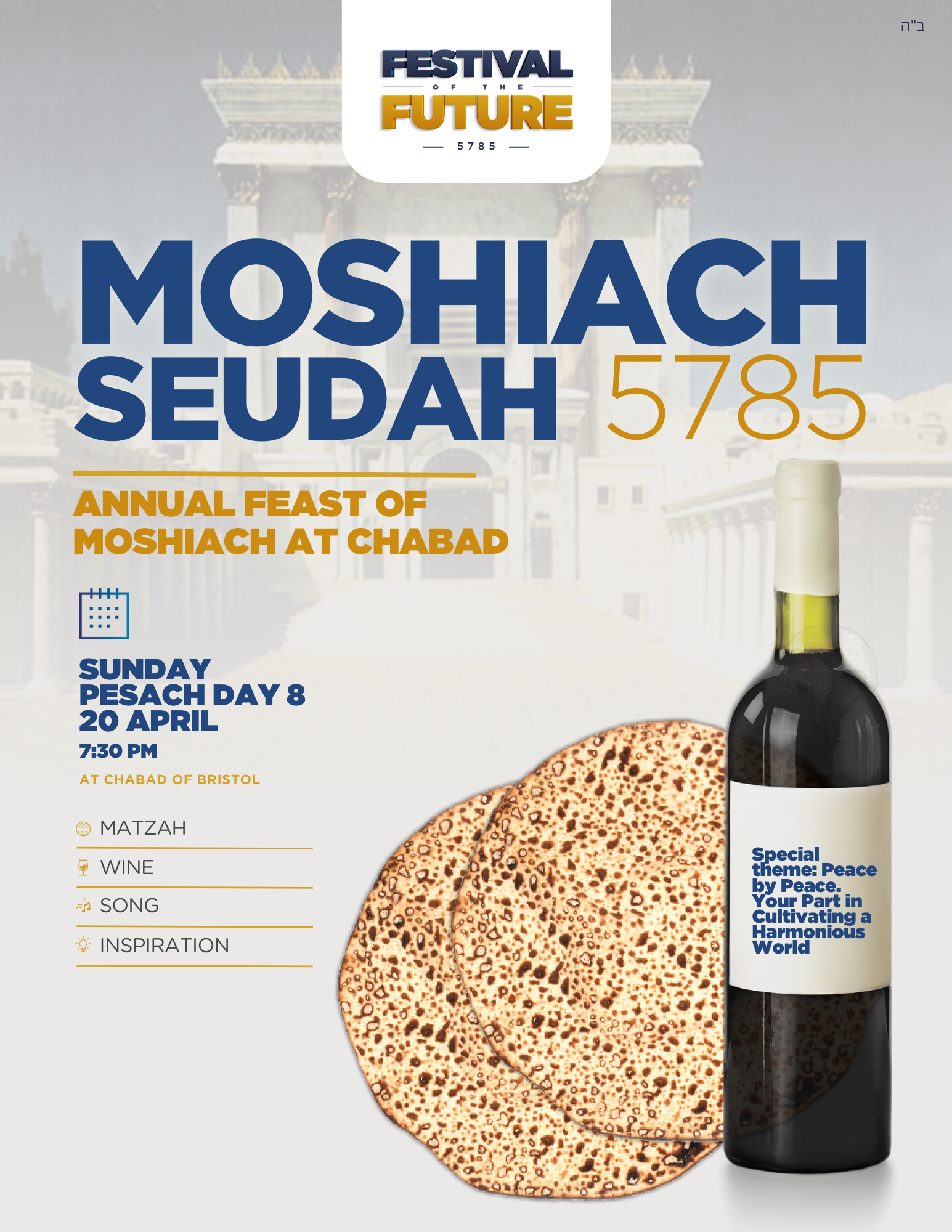 Join us for the traditional Feast of Moshiach, an inspirational evening and closing of Pesach as we look forward to the Future Redemption.